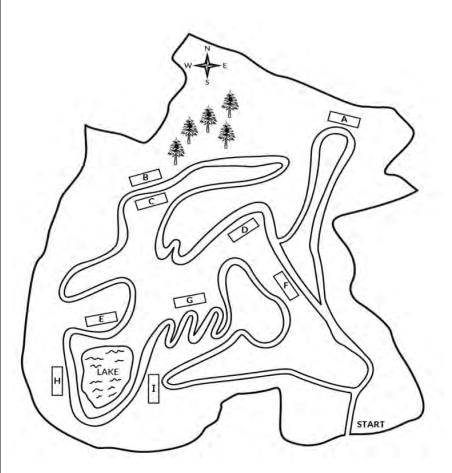 Now, some of the competitors are not doing the full race. They’re taking part in what we call the Easy Riders race ... though it’s still a challenge, for sure. We need volunteers at the Easy Riders finish point to make sure these competitors get off the track safely and store their bikes in the right place. See where the lake is near the bottom of the map? You’ve got two places marked out either side of the lake. The location of the finish point is to the west of the lake, OK? Just make sure they get off the track as quickly as possible.