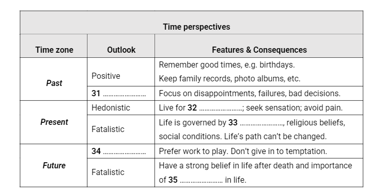 Looking at the future time zone, we can see that people classified as future active are the planners and go-getters. They work rather than play and resist temptation. Decisions are made based on potential consequences, not on the experience itself. A second future-orientated perspective, future fatalistic, is driven by the certainty of life after death and some kind of a judgement day when they will be assessed on how virtuously they have lived and what success they have had in their lives.